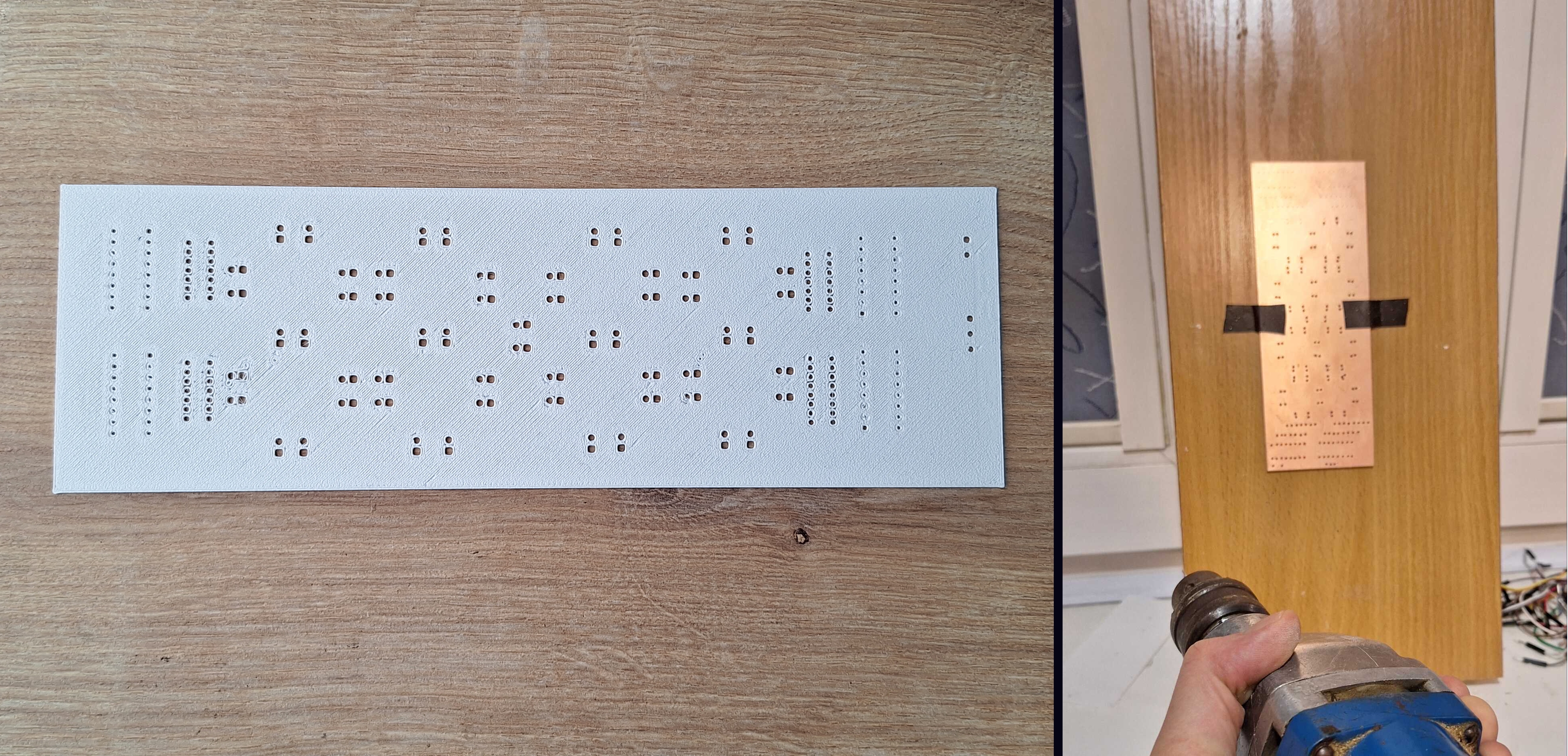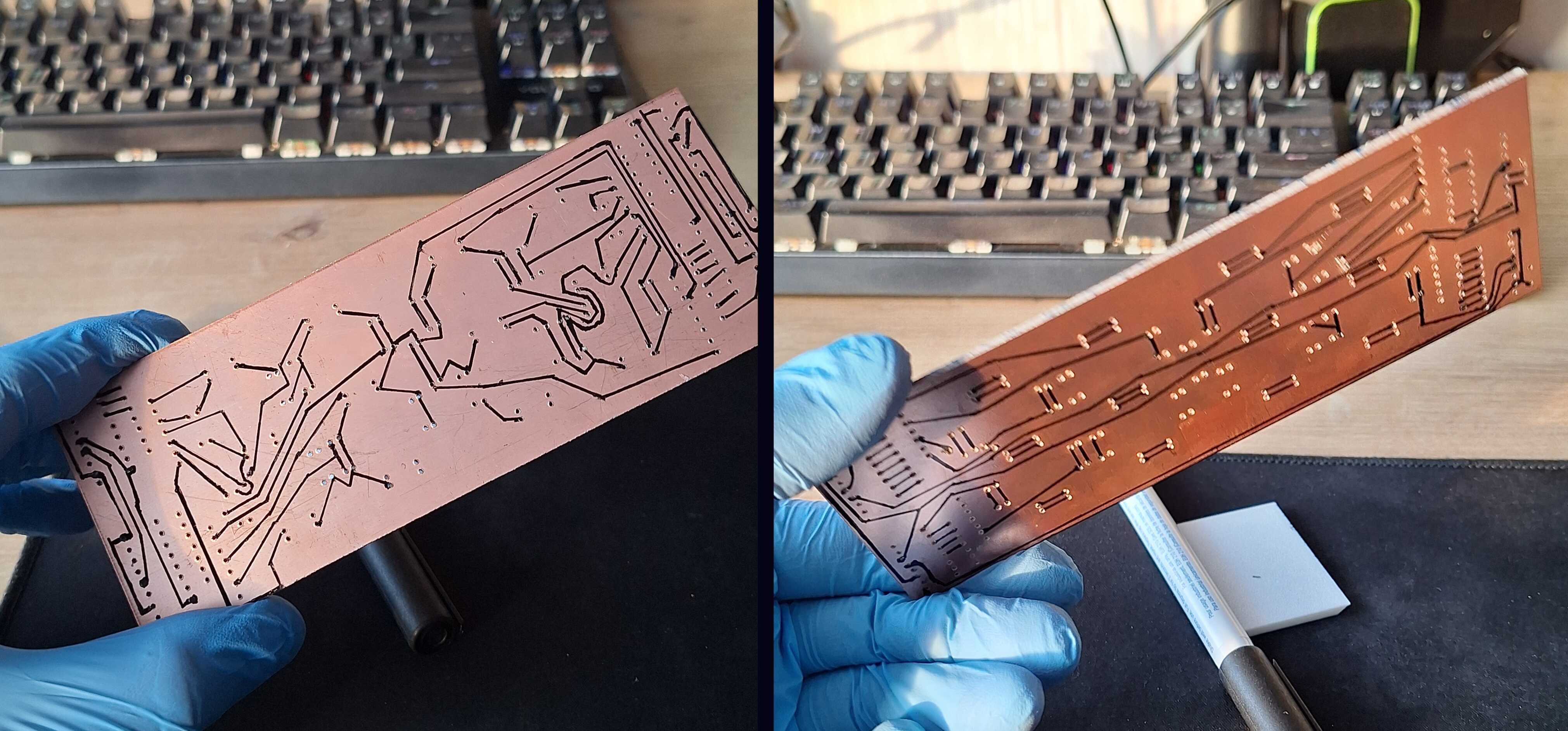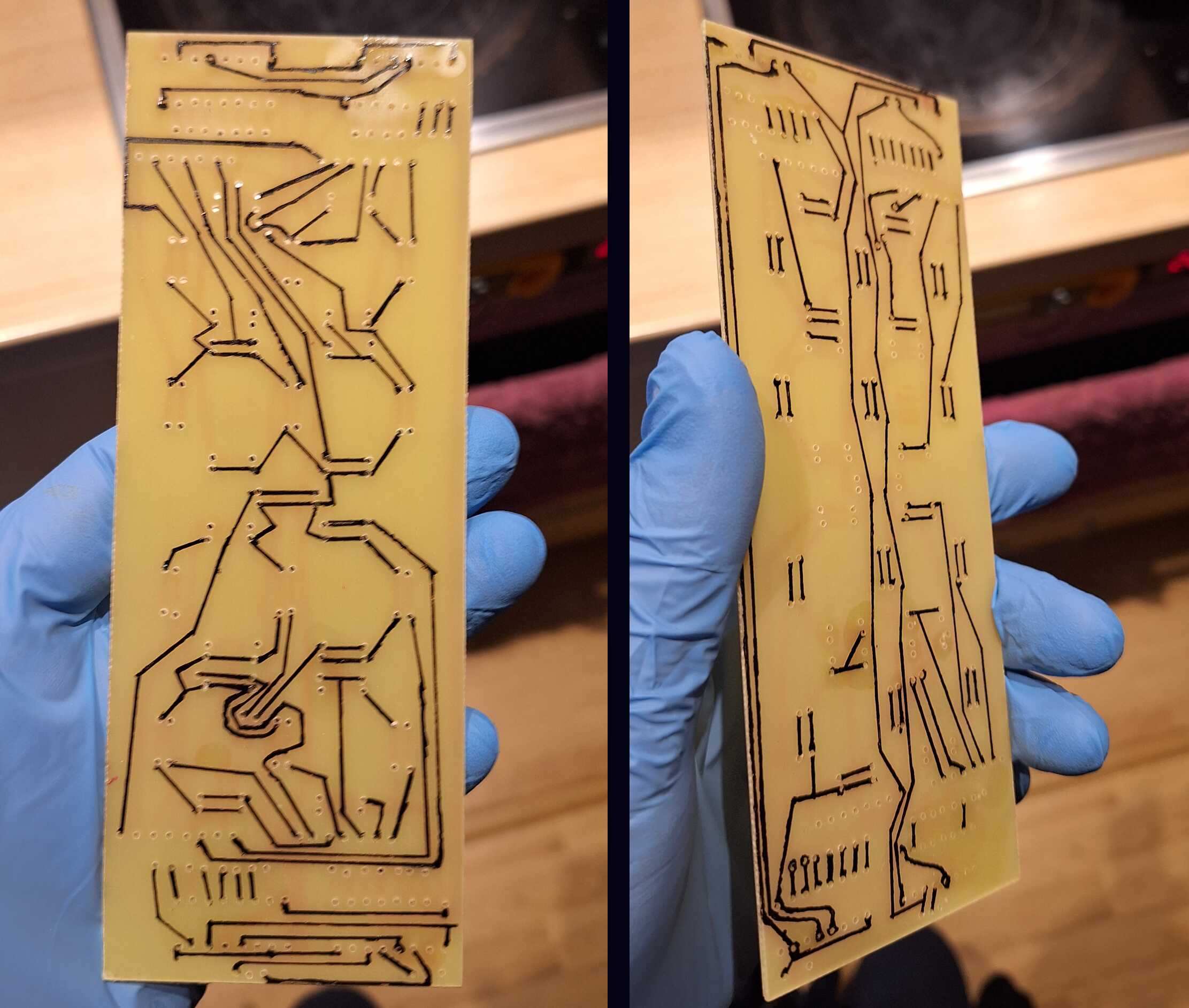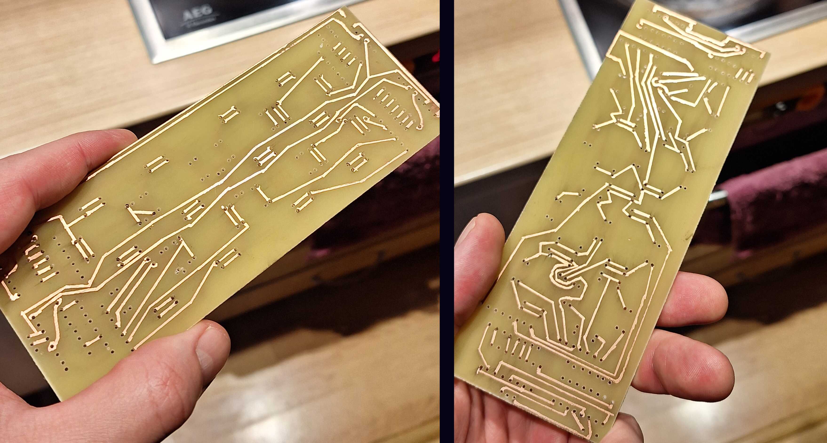 in KiCad and drew them by hand between the holes I drilled. It turned